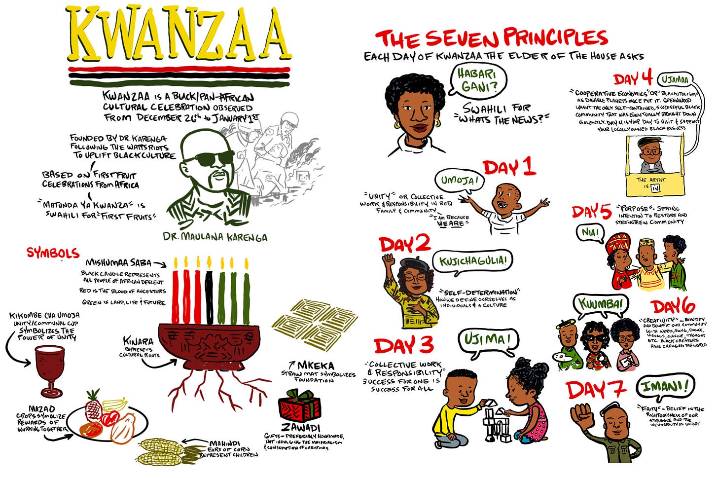 Reposting this ever(red, black and)green poster from a couple years ago. Habari Gani? Happy #Kwanzaa. #graphicnotes #sketchnotes #illustration #wip Re-reading this now, I can’t remember half of it! I’m a day late to the party and slipping on upholding my part of the tradition, but I will employ today’s lesson of self-determination to push forward ✊🏾 ✊🏽 ✊🏿